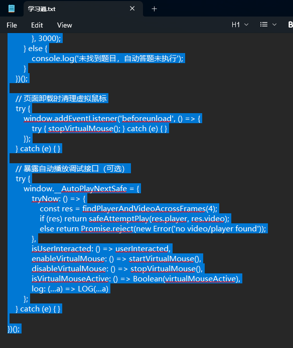 目前仅支持自动刷视频和半自动答题(答题是自动的但是无法自动提交),题目仅支持多选单选与判断 所以如果需要刷课的话请先答题,再看视频 如果没有进行自动播放或者鼠标里面页面就会暂停视频视频请F5刷新页面